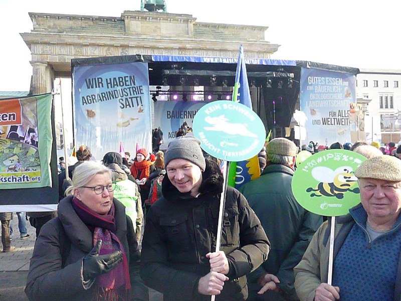 32 Menschen aus dem Osnabrücker Land beteiligten sich auf unsere Initiative an der bundesweiten Demo am 19. Januar in Berlin unter dem Motto „Wir haben es satt“ für bessere Tierhaltung, gesündere Lebensmittel und gerechtere soziale Verhältnisse. „Wir müssen raus aus der Massentierhaltung hin zu einer bäuerlichen Landwirtschaft mit Preisen, von denen die Familien auf den Höfen gut leben können“, so Sprecherin der Georgsmarienhütter Grünen, Monika Wessendorf (siehe Foto links).