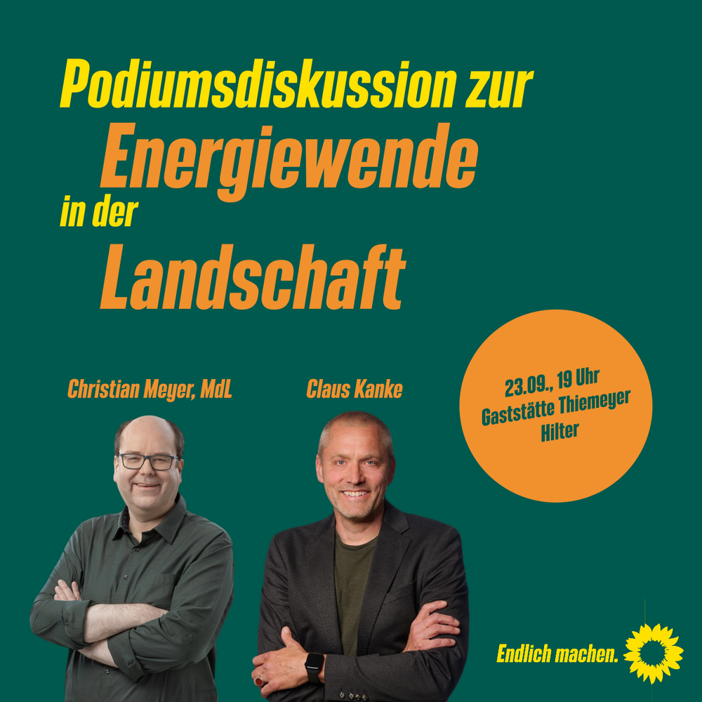 Christian Meyer kommt in den Südkreis: in Hilter-Borgloh (Gasthaus Thiemeyer, Am Thie 1, 49176 Hilter) gibt es ab 19 Uhr eine Podiumsdiskussion zum Thema „Energiewende in der Landschaft“. Kommt gerne vorbei und nehmt Interessierte mit! Neben Christian Meyer werden auch unser Landtagskandidat Claus Kanke und Prof. Dr. Dieter Rödel dabei sein.