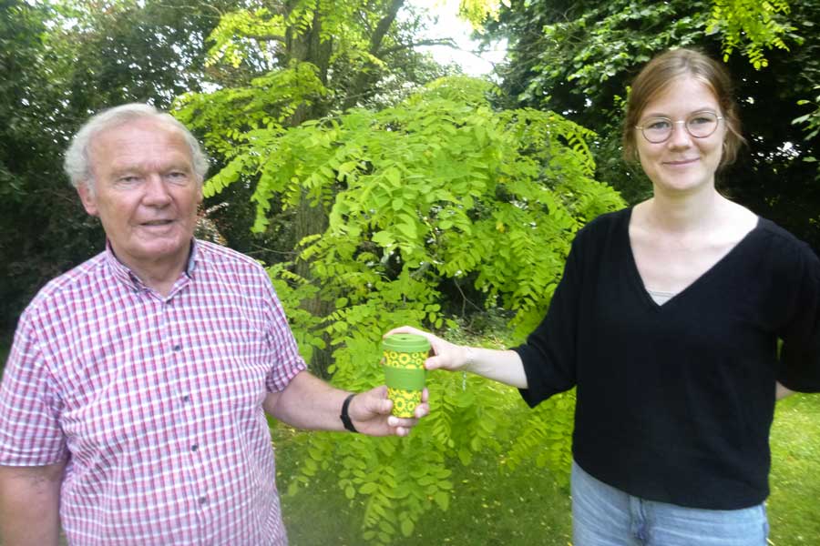 Seit dem 04.06.2021 ist Aloys Suntrup aus Belm das 600. Mitglied der Grünen im Osnabrücker Land. Aus diesem Grund überreichte Geschäftsführerin Luca Wirkus ihm ein kleines Präsent – einen Kaffeebecher. „Normalerweise werden Mitglieder von ihren Ortsverbänden begrüßt, aber zu diesem Anlass sage ich gerne persönlich Hallo“, so Wirkus.