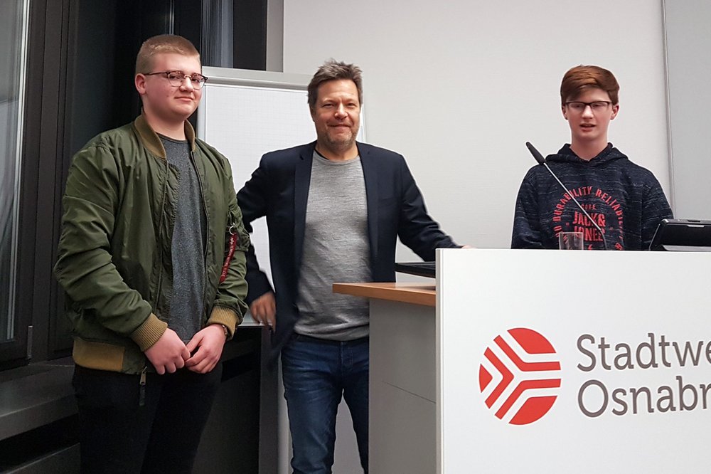 Um Energiepolitik ging es beim Gespräch mit Robert Habeck im Gebäude der Osnabrücker Stadtwerke. Über ihr Projekt zur Untersuchung von Verbrennungsmotoren berichteten Daniel und Noah von der Glandorfer Ludwig-Windhorst-Schule. Dabei sei es vor allem um Wasserstoff und Brennstoffzellen gegangen. "Keines" bekamen die Schüler auf ihre Frage zur Antwort von Habeck, welches Auto er sich erwerben würde, da er den Öffentlichen Nahverkehr bevorzuge. Doch für den gebe es auf dem Lande wie in Glandorf noch erheblichen Verbesserungsbedarf. In einem weiteren Gesprächging es um Fragen der Grundsicherung.