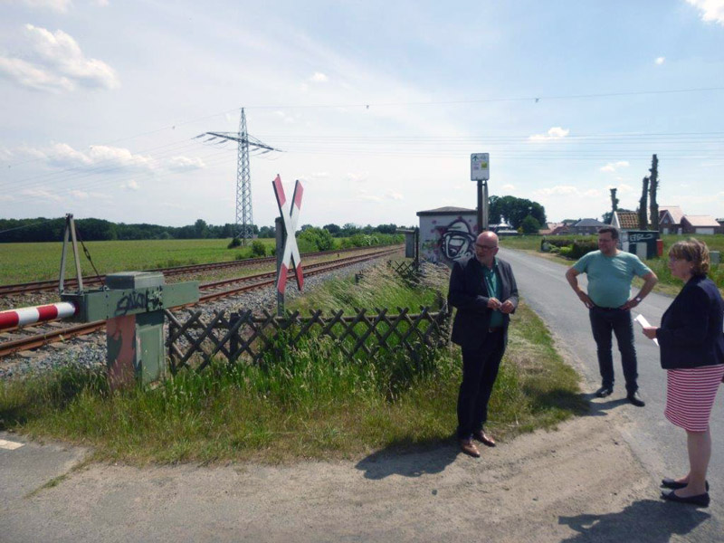 Endlich eine Lösung für die Reaktivierung des Haltepunktes Alfhausen erwartet die dortige Bürgermeisterin Agnes Droste vom für diesen Sommer angekündigten Gutachten zur Bahnstrecke Osnabrück-Oldenburg. Dass die Gemeinde durch weiteren Wohnbau am ehemaligen Bahnhof für eine Erhöhung des Fahrgastpotentials gesorgt hat, konnte Schulz-Hendel beim Gang zum wenig nördlich geplanten zukünftigen Bahnhalt feststellen. Jetzt gelte es, mit Möglichkeiten wie Zweigleisigkeit, Elektrifizierung und neuen Triebwagen Alfhausen wieder ans Bahnnetz anzuschließen. Besonders beeindruckt war Schulz-Hendel vom Engagement vor Ort über alle politischen Grenzen hinweg für die Haltepunkte. Das sei ein wichtiger Schritt zum Erfolg.